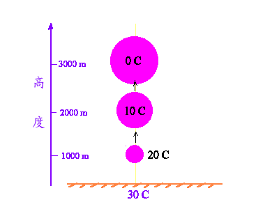 空中。不過在形成的機制上彼此是有頗大的差異。 由於大氣的氣壓是由下而上遞減的,當空氣(氣塊)上升時,環境的氣壓下降,氣塊的體積變大 。如果空氣的上升是由於熱力造成的浮力所趨動,則上升速度會快到氣塊來不及和環境大氣有熱 的交換,稱為絕熱運動。所以氣塊中的內能並沒有損失,但體積卻在變大,單位體積的內能在減 少,導致溫度降低,稱為絕熱冷卻。換句話說,當氣塊在上升時,內部的溫度在下降,而水汽含 量如果沒有損失,相對濕度就會上升,直到飽和或足以凝結在凝結核上。這些凝結的小水滴就是 我們看到的雲。