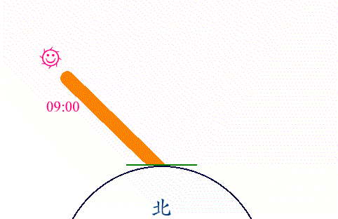 地球每天自轉一週,所以對地面上的同一點,太陽的位置一直在改變,清晨太 陽由東方地平線起來,中午到達正上空,傍晚又從西方下去,然後夜晚降臨, 直到第二天太陽再從東方上來為止,如此週而復始。和季節變化類似的,在一 天之中陽光的入射路徑和地面的夾角也在變化,在上午時陽光斜射,因此地面 接受到陽光強度比較弱,在中午時達到最強,到了下午在地面上的強度又逐漸 減弱。於是氣溫也跟著發生變化(見下頁)。