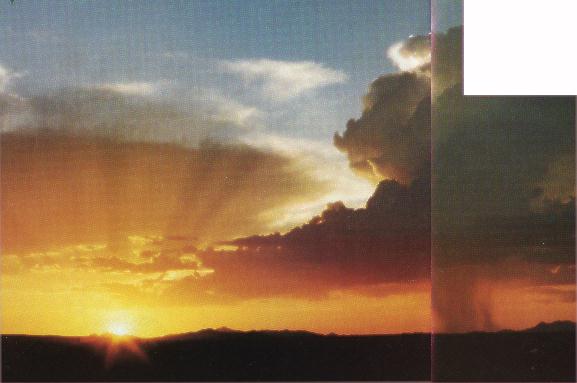 燦爛的晚霞最常在有對流系統出現在西方的時候(在對流系統出現在東方時, 朝陽也是一樣的絢爛),這是因為在對流系統及其週邊都帶有充沛的水滴,水 滴可以有效的散射紅色光的緣故。在中、高緯度地區,氣象系統都由西方向東 方移動,所以當晚霞出現這樣絢爛的情景時,即預示天氣將變壞了。但在台灣 氣象系統由東西南北過來都有可能,這個法則常常是行不通的。圖片取材自 Weatherwise, 1997。