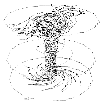 電腦出來的颱風結構,可見颱風中低層才是逆時針旋轉的,高層由於是 流出的地方,反而是順時針方向旋轉的。所以由衛星雲圖上看,颱風的 雲層是順時針方向旋轉的。
