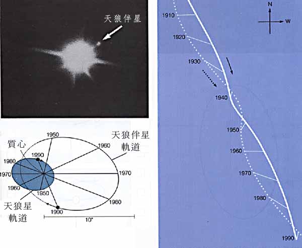 左 上 圖 : 天 狼 雙 星 在 原 來 被 歸 類 為 天 文 雙 星 (astrometric binary), 1960年 ,天 文 學 家 拍 得 這 張 照 片 後 , 重 新 歸 類 成 目 視 雙 星 系 統 左 下 圖 : 天 狼 雙 星 相 對 於 其 質 心 的 軌 道 。 右 圖 : 天 狼 主 星 (實 線) 與 天 狼 伴 星 (虛 線), 在 天 空 運 行 的 軌 跡 。