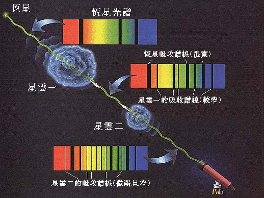 假 設 星 光 又 透 過 溫 度 低 於 "星 雲 一" 的 "星 雲 二", 現 在 星 光 中 又 增 加 了 "星 雲 二" 物 質 的 吸 收 譜 線 , "星 雲 二" 的 譜 線 最 窄 , 所 以 可 以 判 別 。 天 文 學 家 用 分 光 儀 分 析 , 可 以 把 "星 雲 一 與 二" 的 的 化 學 組 成 定 出 來 。 另 外 根 據 譜 線 的 紅 位 移 量 , 也 可 以 定 出 星 雲 的 運 動 速 度 。