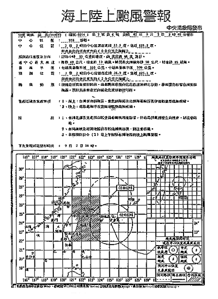¤¤¥¡®ð¶H§½µo¥¬¤§»ä·Äµ³ø¤º®e¥]§t¨º¨Ç¡H ¡@¡@¤¤¥¡®ð¶H§½µo¥¬ªº»ä·Äµ³ø¡]¦p¹Ï¤Q¤E¡^¡A¤º®e¥]¬A¤U¦C¦U¶µ¡G úϻ䷺ØÃþ¤Î¦WºÙ¡G»¡©ú»ä·ªº±j«×¤Î¨ä¦WºÙ¡C úÐ¥»¦~¦¸¼Æ½s¸¹¡G¥H¥|¦ì¼Æ¦rªí¥Ü¡A«e¤G¦ì¬°¦~¥÷¡A«á¤G¦ì¬°¥»¦~¤º µo¥Í»ä·ªº¦¸¼Æ¡C úѸ¹¦¸¤Î³ø¼Æ¡G»¡©ú¥»»ä·Äµ³ø¬O¥»¦~²Ä´X¸¹Äµ³ø¡A¤Î¥»¸¹Äµ³øªº²Ä ´X¦¸³ø¾É¡C úÒµoªí®É¶¡¡G»¡©ú»ä·Äµ³øªºµo¥¬®É¶¡¡C úÓ¤¤¤ß¦ì¸m¡G¥H¸g½n«×ªí¥Ü¡A¨Ã»¡©ú»P¥xÆWªº¶ZÂ÷¡C úÔ¶i¦æ³t«×¤Î¤è¦V¡G³t«×¥H¨C¤p®É¤½¨½¼Æ¬°³æ¦ì¡A¶i¦æ¤è¦V±Ä¥Î¤Q¤» ¤è¦ì¡C úÕªñ¤¤¤ß³Ì¤j·³t¡G¥]¬A¤Q¤ÀÄÁ¥§¡·³t¤ÎÀþ¶¡³Ì¤j°}·ªº¨C¬í¤½¤Ø ¼Æ»P¯Å¼Æ¡C úּɷ¥b®|¡G»¡©ú±q»ä·¤¤¤ß¦V¥~¦Ü¥§¡·³t¨C¬í¤Q¤¤½¤Ø¡]¤C¯Å·¡^ ³Bªº¶ZÂ÷¤Î¨C¬í¤G¤Q¤¤½¤Ø¡]¤Q¯Å·¡^³Bªº¶ZÂ÷¡C ú×¹w´ú¦ì¸m¡G¹w´ú¤G¤Q¥|¤p®É«áªº»ä·¤¤¤ß¦ì¸m¡C úػ䷰ʺA¡G¤ÀªR°Ê¦V¤Î¹w´ú¦¹»ä·ªºÅܤƱ¡§Î¡C úvĵ³ø°Ï°ì¤Îĵ§Ù¨Æ¶µ¡G»¡©úÀ³§Ù³Æ°Ï°ì¤ÎÀ³ª`·N¨¾½d¨Æ¶µ¡C úwªþµù¡Gµø»Ýn¥i¼W¥[¦¹¶µ»¡©ú¡C úx¤U¦¸Äµ³ø¹w©wµo¥¬®É¶¡¡C úy»ä·°ÊºA¥Ü·N¹Ï¡C